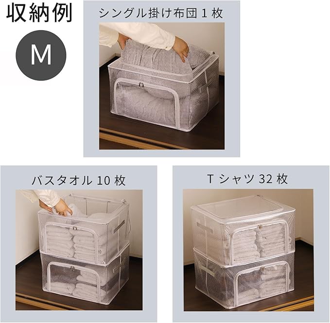 【参考収納枚数】Mサイズ:Tシャツ32枚・バスタオル10枚・シングル掛け布団1枚 Lサイズ:Tシャツ52枚・バスタオル14枚・ダブル掛け布団1枚