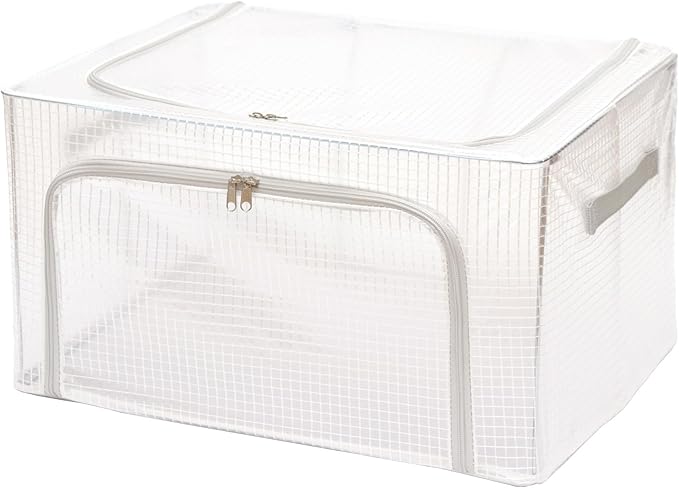 積み重ねたまま出し入れOK!スチール芯材入りでしっかり自立するクリアボックス。