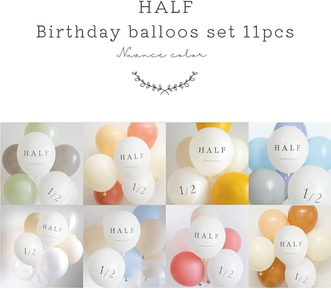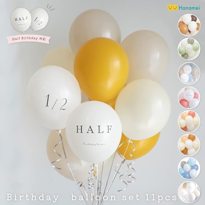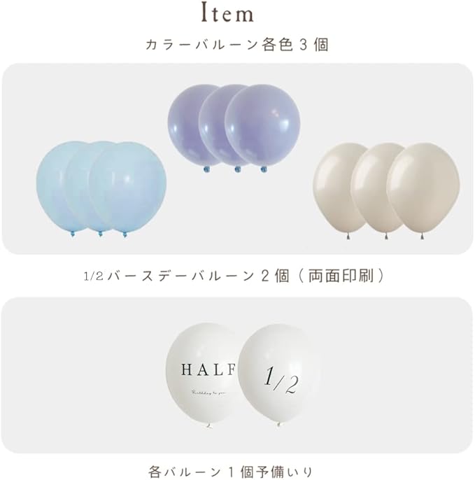 【セット内容】 ①カラーバルーン3色:各色3個(プラス各色予備1個) ②HALF・1/2文字入りバルーン:2個(プラス予備1個)お好みのカラーでアレンジを楽しんだり、 お部屋の省スペースやペットのアニバーサリーフォトにもおすすめです!