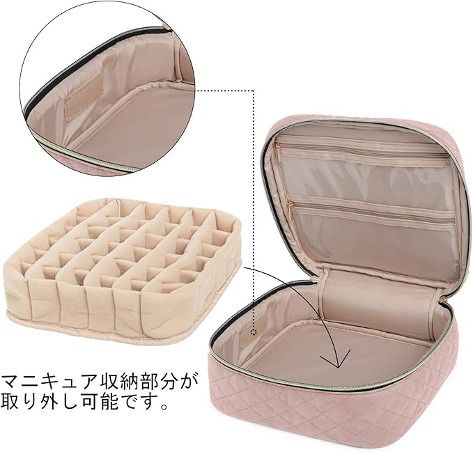 大容量:調整可能な仕切りパッドのある収納部分には36ボトルのマニキュアを収納することができます。2つの透明ポケットには爪やすり、ネイルパーツ、ステッカーなどのネイル道具を収納することができます。(高さ8.25cm以下のボトルにフィットすることにご注意ください)