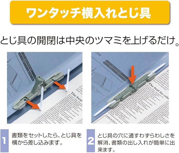 とじ具を横にスライドするだけの「ワンタッチ横入れ式」樹脂とじ具で操作が簡単です。