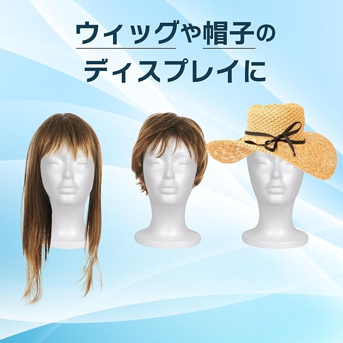 発泡スチロール素材でできており、軽くて持ち運びも便利です。ウィッグスタンドや帽子のディスプレイなどとしてご利用いただけます。