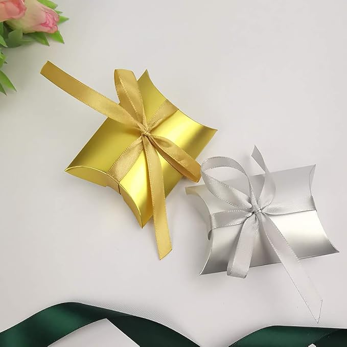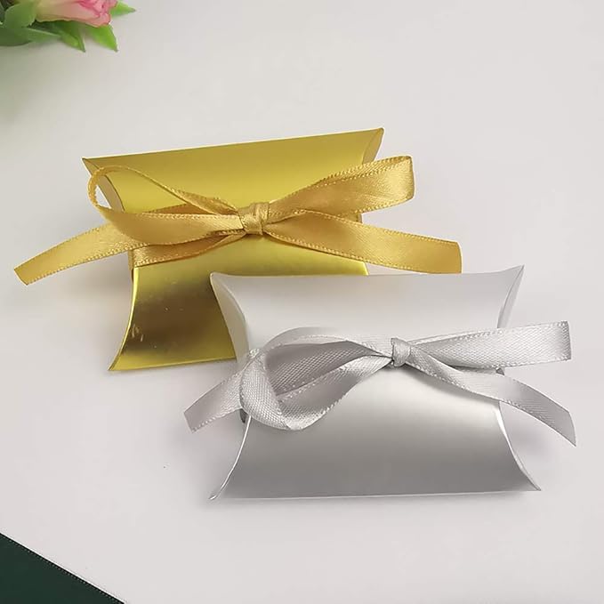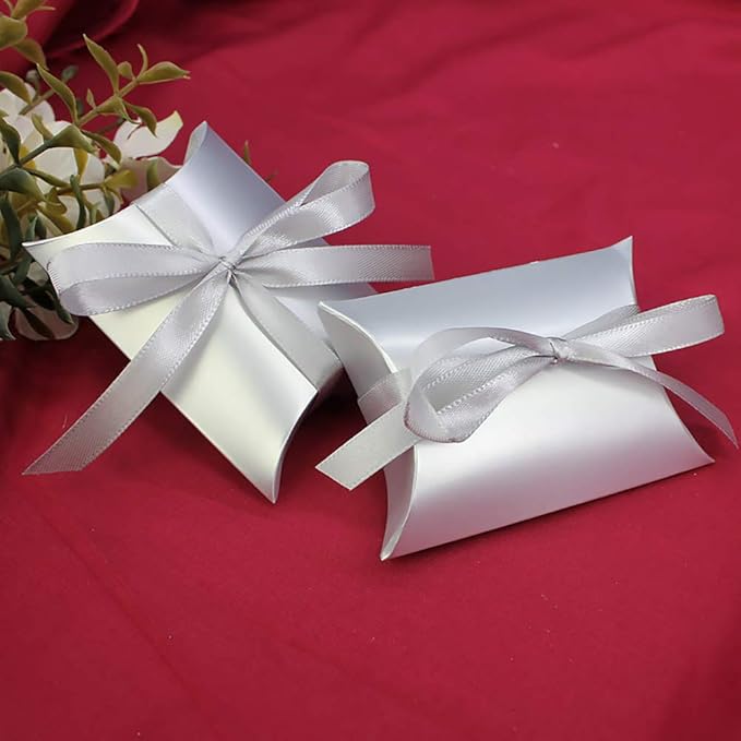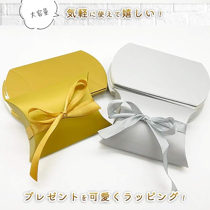 moin moin ラッピング リボン付き 50枚セット | ピアス アクセサリー ピローボックス 枕型 | 幅9 縦6.5 奥行2.4cm | 銀色 | (シルバー シルバーリボン) 2007ra223