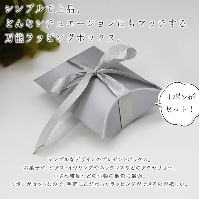 シンプルなデザインのプレゼントボックス。お菓子や、ピアス・イヤリングやネックレスなどのアクセサリー、小さめ雑貨などの小物の梱包に最適◎リボンがセットなので、手軽にこだわったラッピングができるのが嬉しい♪