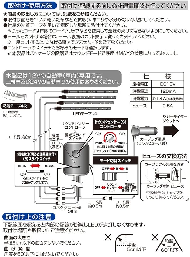 カープラグ~コントローラまでのコード長:約0.5mコントローラ~コネクタまでのコード長:約1m(カープラグ側は0.5m)コネクタ~LEDユニットまでのコード長:約2m6灯LEDテープ4本入DC12V車専用0.5Aヒューズ内蔵