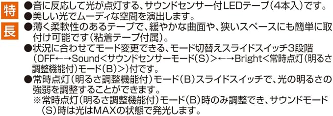 状況に合わせてモード変更できる、モード切替えスライドスイッチ(OFF←→sound←→bright)付。