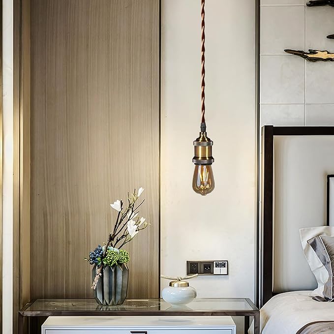1灯ペンダントライト コンセント式 450cmツイストコード レッドコード 中間ON/OFFスイッチ付き 器具のみ 口金E26 真鍮色電球ソケット コンセント式 スイッチ付き 吊り下げ 天井照明 真鍮メッキ オシャレ レトロ 取り付け簡単 インテリア照明 電球別売り