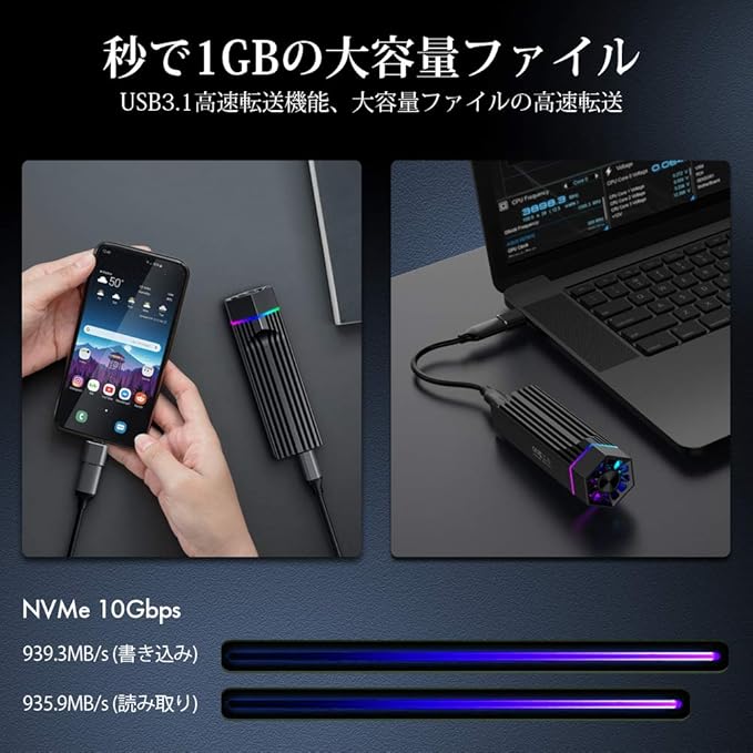 ineo M.2 PCIe NVMe SSD外付ハードドライブケース アルミデッキ 7色のRGBライト UASP及びTrim指令に対応 [C2605 NVMe] ブラック
