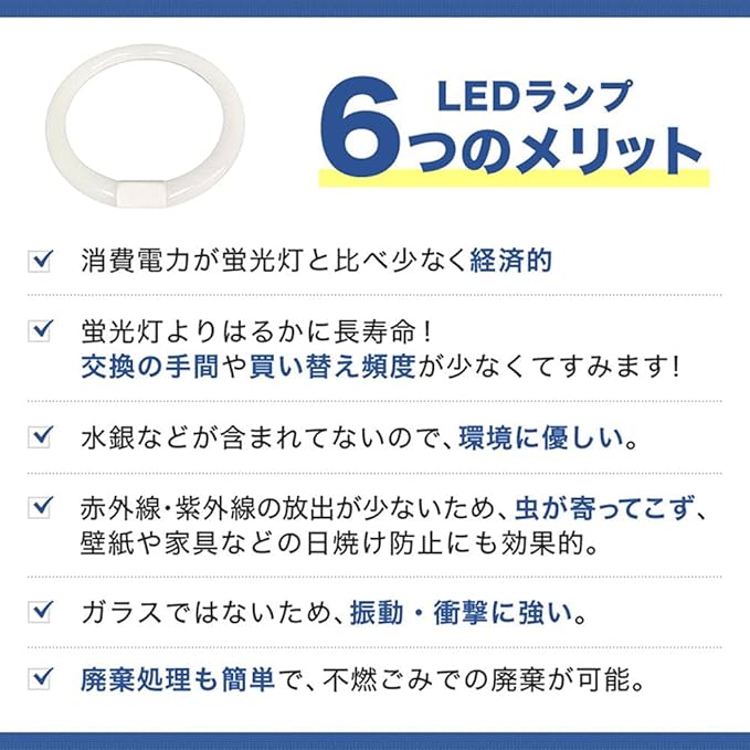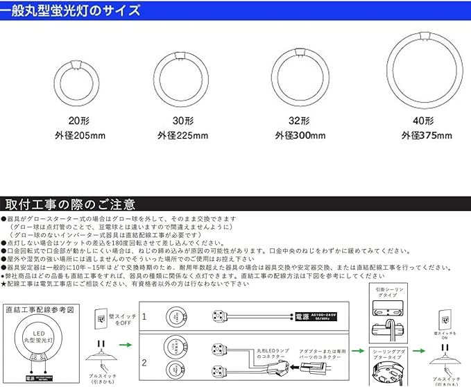 【グロー式工事不要】:電気工事なしで既存の丸型蛍光灯器具にそのまま取り付け可能なグロー式です。※お使いの器具がグロースターター式の場合は、工事不要でグロー球を外すだけで使用できます。グローランプの付いていないラピットスタート方式、 インバーター(電子安定器)方式の場合は直結工事が必要ですので電気事店にご相談ください。