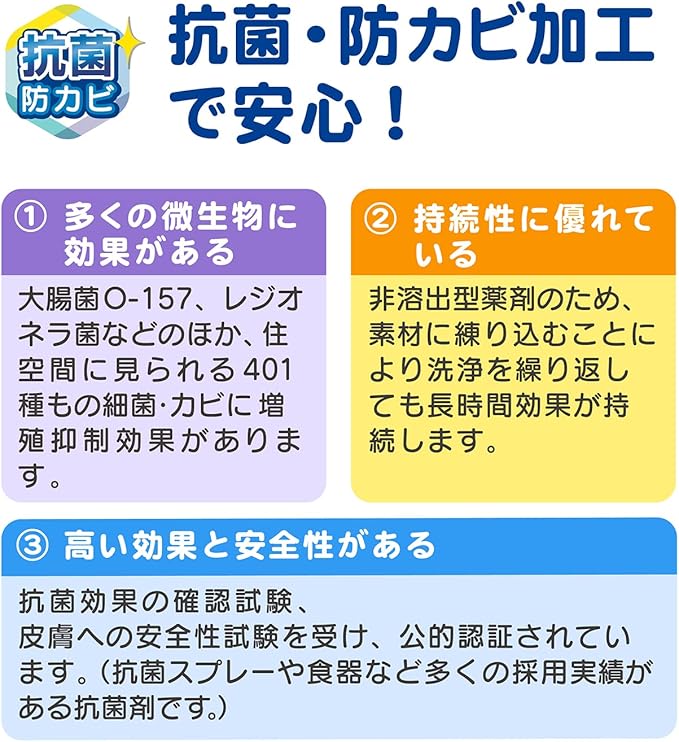 【抗菌・防カビ加工について】1:多くの微生物に効果がある。 2:持続性に優れている。3:高い高価と安全性が公的認証されています。(抗菌スプレーや食器など多くの採用実績がある抗菌剤です)