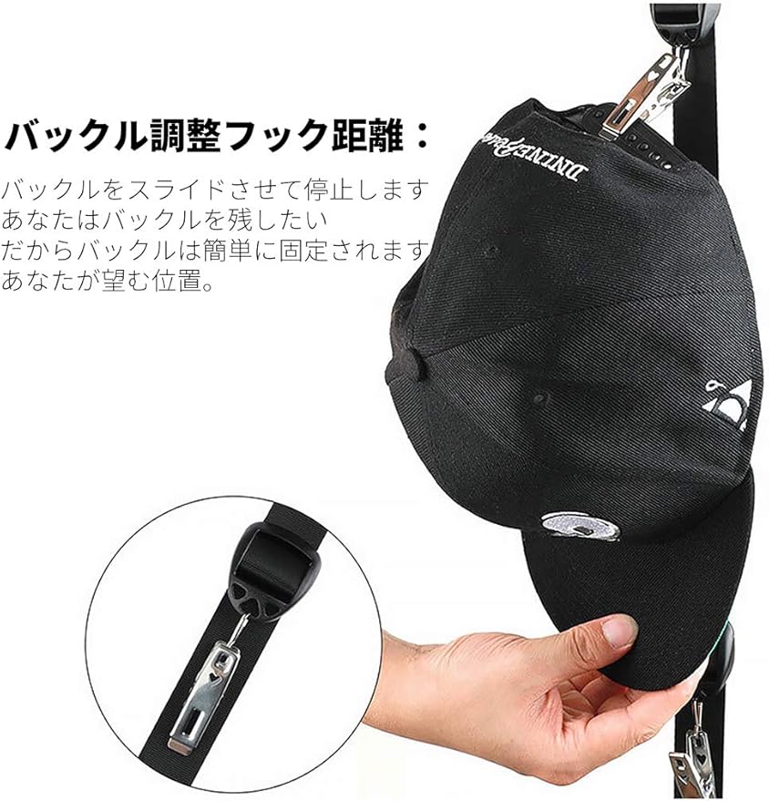 最大20個のキャップを保持:屋外または壁に最大20個の野球用キャップまたはバイザーを保管および整理します。1本のストラップが付属しています。各ストラップには20個のキャップまたはバイザーを保持するための20個のフックがあります–合計20個のフック。調整可能なキャップで最適に機能します。 とバイザー。