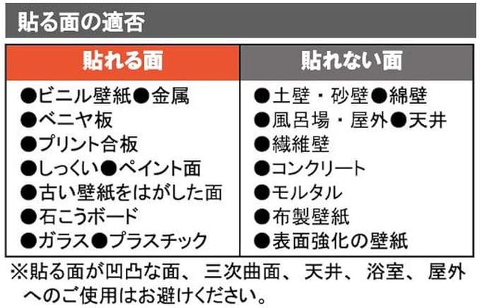 貼れる面:ビニル壁紙、金属、ベニヤ板、プリント合板、しっくい、ペイント面、古い壁紙をはがした面、石こうボード、ガラス、プラスチック