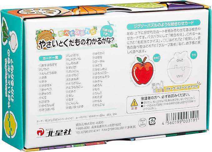 左右、上下に分かれたカードをバラバラにして、絵合わせしたり、名前当てクイズ、絵探し、グループ集めなどお子様からお年寄りまで楽しく遊べる知育玩具です。