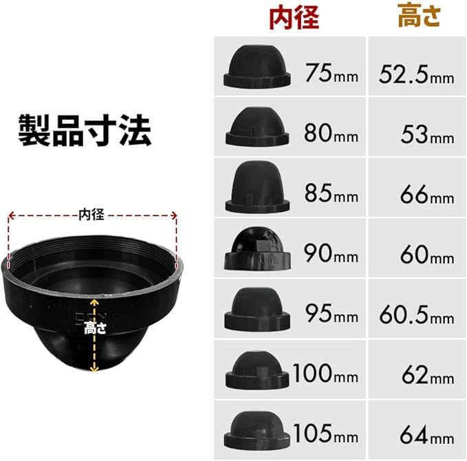 加工不要かつゴム素材なので伸縮性もあり、取付も簡単です。ご購入のおすすめ‥例)ヘッドライトユニットバルブ挿入口の内径が102mmの場合 → 100mm / 105mm のどちらかをお選びいただくことおすすめします。この時105mmを選び、蓋をした時に緩いなと感じましたら結束バンドやブチルテープを使用し、さらに防水対策いただくことをおすすめいたします。