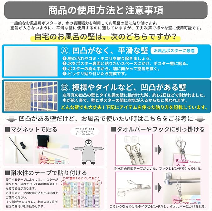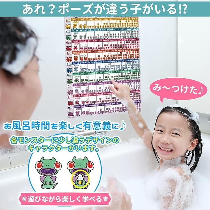 目で見てわかって英語も覚えられる!九九の表ポスターです。耐水性でお風呂用で使える。A2サイズ。お風呂の壁に、水で貼りつけられます。
