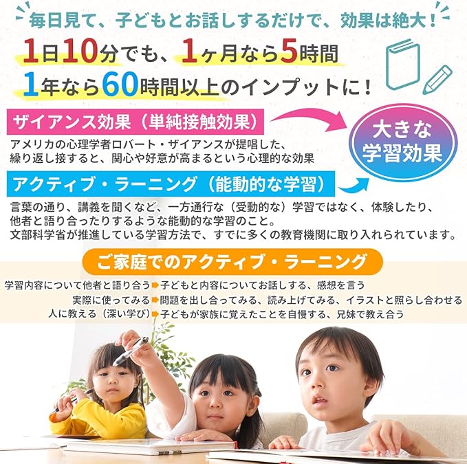 可愛いモンスターと九九を学ぼう!かけ算の仕組みがイラストで、目で見てわかる。九九の導入に最適な、2とび、5とびの数も学べるので、就学前の小さなお子様にもピッタリ。2とびは地域によって言い方が分かれるので、それぞれの地域のお子様に使っていただけるように、モンスターのセリフで工夫をしています。