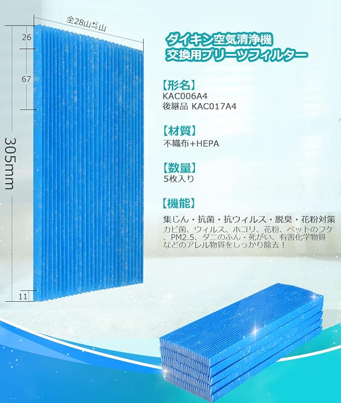 ダイキン 空気清浄機交換用フィルター プリーツフィルター KAC017A4/KAC006A4の後継品にご対応 集じん・抗菌・脱臭・花粉対策 互換品 5枚入り
