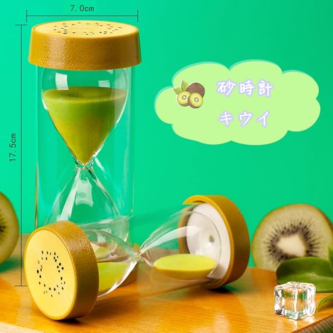 【フルーツ形】砂時計の時間は本体のカラーと流動時間によって異なっています。オレンジ、スイカ、レモンとキウイ全4種カラーが選択可能。3分、5分、10分、15分、30分、45分、60分全7種サイズでご用途に合わせてお気軽に使えます。