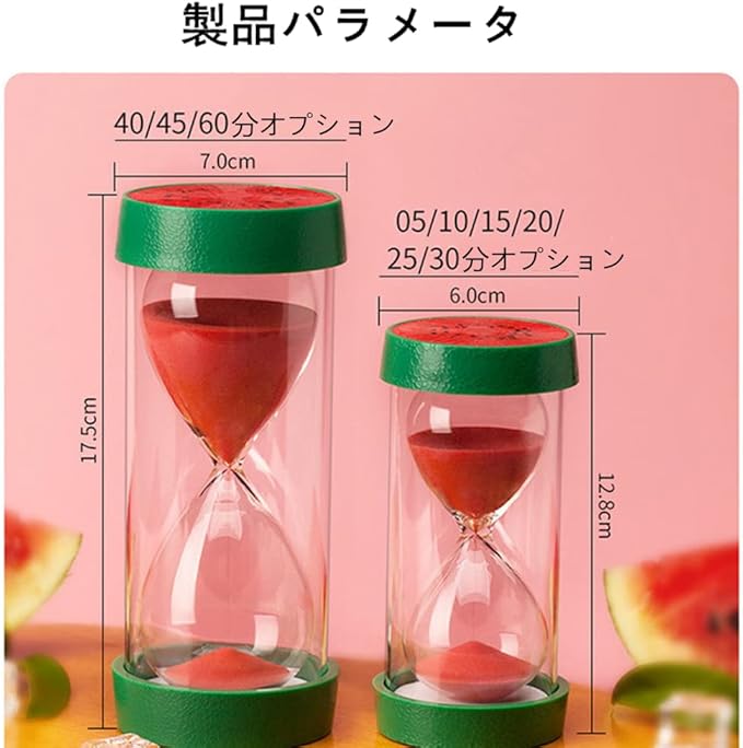 【砂時計タイマー 仕様】サイズ:6*12.8cmと7*17.5cm。砂のカラー:スイカレッド、レモンイエロー、オレンジとキウイイエロー。重さ:130gと230g
