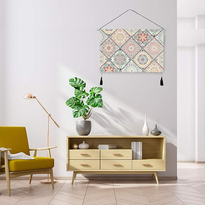 【パッケージ】:サイズ:62cm * 42.6cm。タペストリー本体*1、棒*1、縄*1、タッセル*2、無痕フック*2。簡単に組み立てられます。 メイン素材:キャンバス