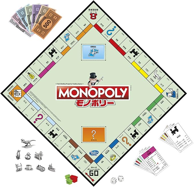 おなじみのボードゲーム、人気「モノポリー」が、東京の地名になって登場! 銀座、原宿、表参道、新宿駅、渋谷駅などの土地や駅を買って、売って、交換して、大富豪を目指しましょう! お気に入りのコマを選びマスに配置したら、勝利を目指してサイコロを振りましょう! 止まったマスの指示に従い、プレイを進めます。もし、誰も所有していない資産のマスに止まったら、購入を検討しましょう。所有する土地の数が多ければ多いほど、より多くのレンタル料が手に入ります。また、誰かが所有している資産に止まったら、所有者へレンタル料を支払わなくてはいけません。チャンスカードや共同基金カードでゲームの流れを変えましょう! お金を手に入れるのは誰?刑務所行きは誰?モノポリーの勝者は一人だけ、それはあなたかもしれません! このモノポリーは8才以上を対象としたパーティーゲームで、戦略的に資産を買ったり、売ったり交換をして、お金持ちを目指す知育ゲームです。またこのボードゲームは子供向けで日本語版になります。家族団らんや、おうちあそび、それからホームスクーリングのアクティビティとしてもおすすめです。 The Hasbro Gaming and Monopoly names and logos, the distinctive design of the gameboard, the four corner squares, the Mr. Monopoly name and character, as well as each of the distinctive elements of the board and playing pieces are trademarks of Hasbro.
