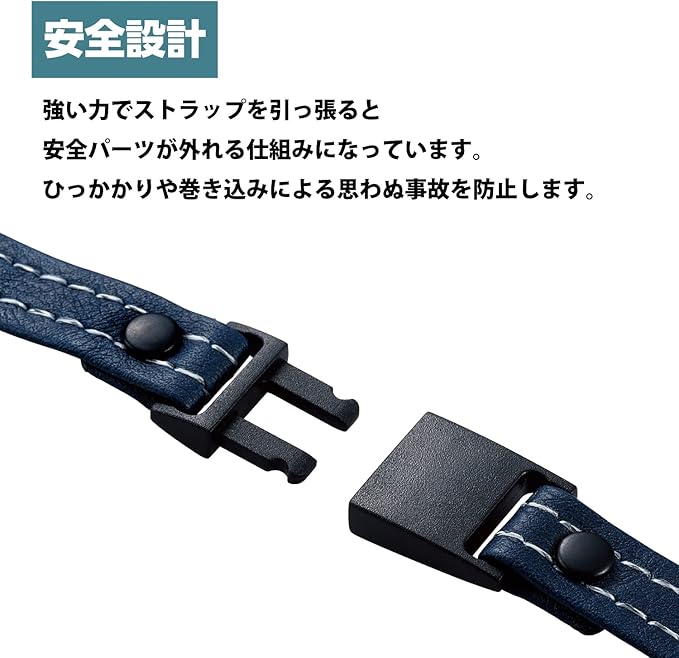 強い力でストラップを引っ張ると安全パーツが外れる仕組みになっています。使用時に、ストラップのひっかかりや巻き込みによる思わぬ事故を防止します。