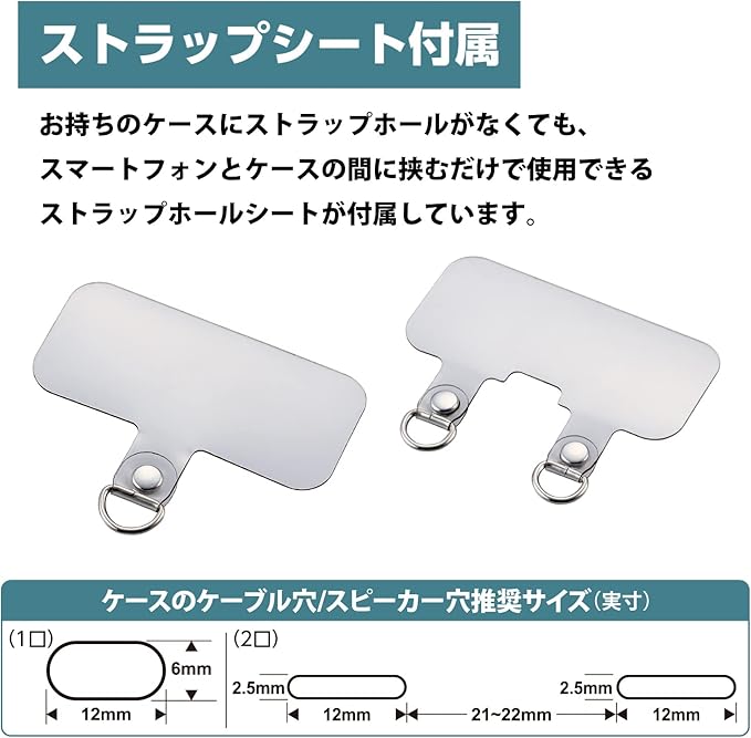 ■お持ちのケースにストラップホールがなくても、付属のストラップホールシートをスマートフォンとケースの間に挟むだけで使用でき、取り外しも簡単です。