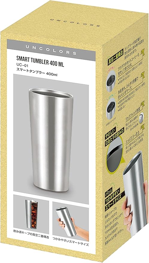 【UNCOLORS(アンカラーズ)】HOT&ICE 真空二重構造 真空断熱層が外の熱をシャットアウト。夏は冷たく、冬は温かく、おいしい温度を長時間キープします。 シンプルデザイン・シンプル加工<商品特徴> ◎真空二重構造 タンブラーの真空層が熱を遮断し飲み物の温度を長持ちさせます。 HOT OK! アツアツのホットコーヒーも安心して持てます。 ・冷めにくい(保温効力:53度以上/1時間) ・外側が熱くならない ICE OK! 氷長持ち。ひんやり持続でおいしいをキープ。 ・抜群の保冷性能(保冷効力:7度以下/1時間) ・氷長持ちで味が薄まりにくい ・結露しない ◎パッとつかみやすいスマートサイズ 細長くシャープなシルエットなので、手の小さい方でもしっかりつかめる安全設計。 大人から子供まで家族みんなが使いやすい。 ◎やさしい口あたりの飲み口 ・リップフィット形状 程よい厚みと曲線が唇に優しくフィット ・エッジミラー仕上 美しく磨かれることで滑らかな流れと優しい口あたりを実現 <商品仕様> 素材:内側/18-8ステンレス、外側/ステンレス鋼 商品サイズ:直径7.2cm 16cm 重量:190g