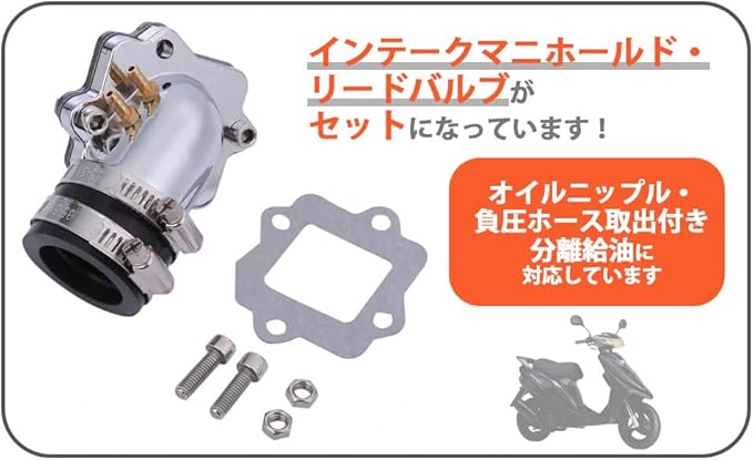 オイルニップル、負圧ホース取出付き分離給油に対応でインテークマニホールド、リードバルブがセットです。エンジンパワーが低下してしまう原因には、インテークマニホールドの劣化が考えられます。エンジンとキャブレターをつなぐ吸気管のパーツがインテークマニホールドと呼ばれ、各気筒にごとに取り付けされています。