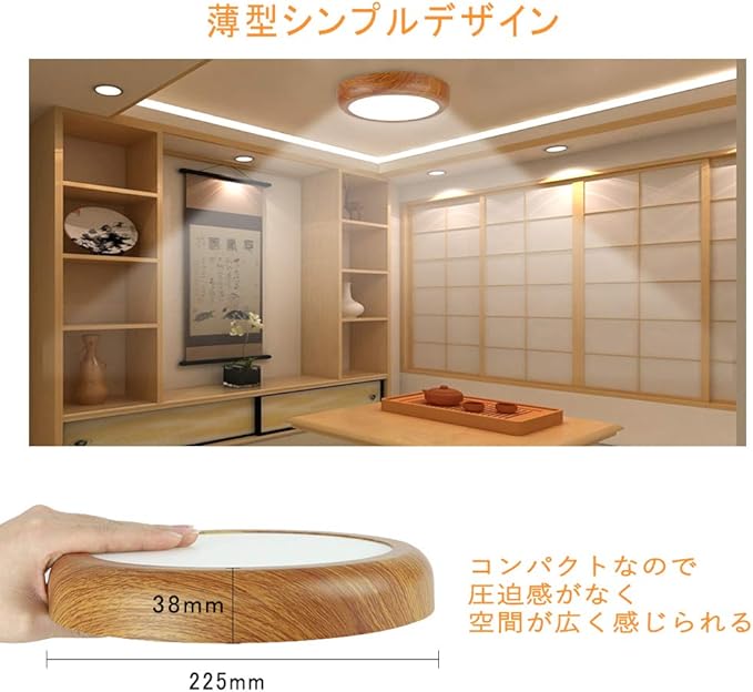 【木目調のデザイン、和室も洋室もぴったり&工事不要で取付簡単】軽量ボデイで(サイズ:直径約225mm 高さ約38mm)和紙模様入りのやわらかい印象なので、和室だけでなく、洋室にもよく馴染みます。部屋の雰囲気に最適シンプルなデザインです。工事不要、女性でも簡単的に取付できます。