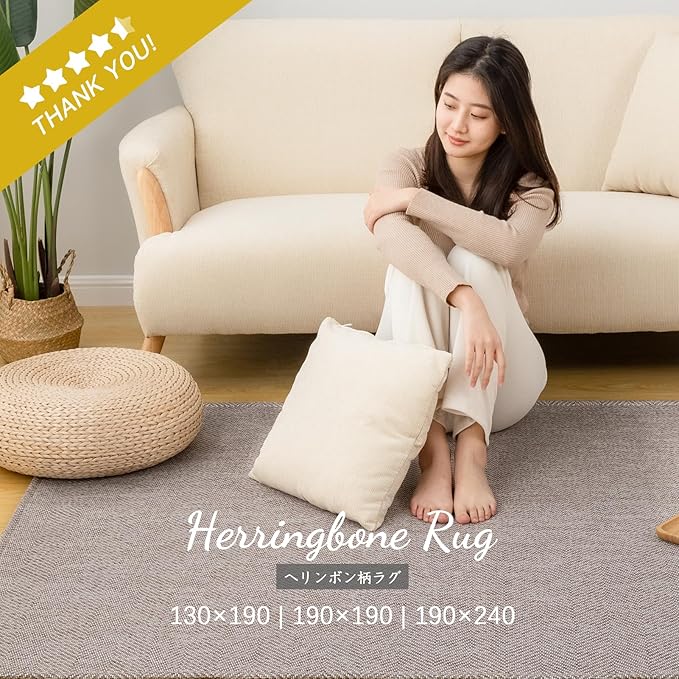 【可愛い編み地模様】こちらのラグは白系の色糸を横に、同色系の色糸を混ぜて、縦に編むことで、立体感のあるヘリンボンに仕上げました。色糸の配分によって立体的なグラデーションに。インテリアの邪魔をせず、どんなお部屋にも馴染みやすいので、いろいろなスタイルを楽しみたい方にも長く愛用していただけます。ペットもお気に入りの一枚です。さらに、ペットが引っ掻いても壊れにくい非常に丈夫な作りになっていますので、安心してご使用いただけます。