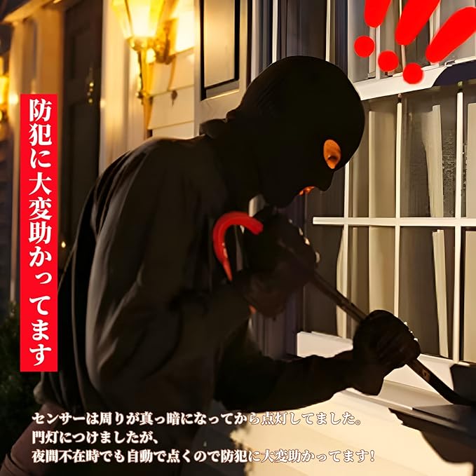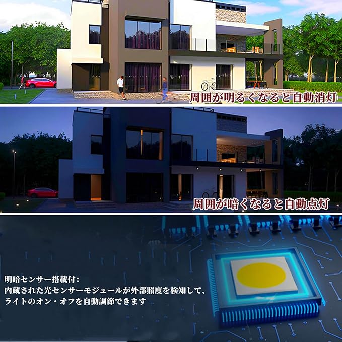 明暗センサー搭載付:内蔵された光センサーモジュールが外部照度を検知して、ライトのオン・オフを自動調節できます。