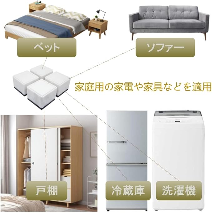 【何でもかさ上げ】脚の直径が5.3cm以内の家電や家具などにピッタリ合います。家庭用洗濯機、ドラム式洗濯機、冷蔵庫、ソファー、テーブル、ベッド、机等に最適です。