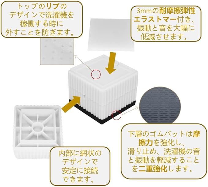 【振動の緩和】MYFEELGAGAのかさ上げ台は三層構造で、上に3mmの耐摩擦弾性エラストマー付き、振動音を大幅に低減させます。中層部分は格子状の内部構造により、揺れを分散させ、防振効果をさらに高めています。下層はTPU(ゴム)が採用され、滑り止め加工で耐摩耗性が高いです。