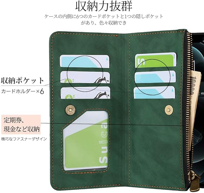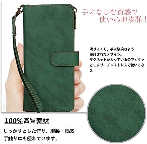 Cavor Galaxy A22 5G SC-56B 対応 スマホ ケース 肩掛け 首かけ 斜めがけ ショルダー カード収納 Galaxy A22 5G手帳型 カバー 二合一 マルチパック ケース SC-56B カード収納 財布型 カバー 2in1 精巧なファスナーデザイン 付きの専属ストラップ同梱なので タンド機能【ダークグリーン】
