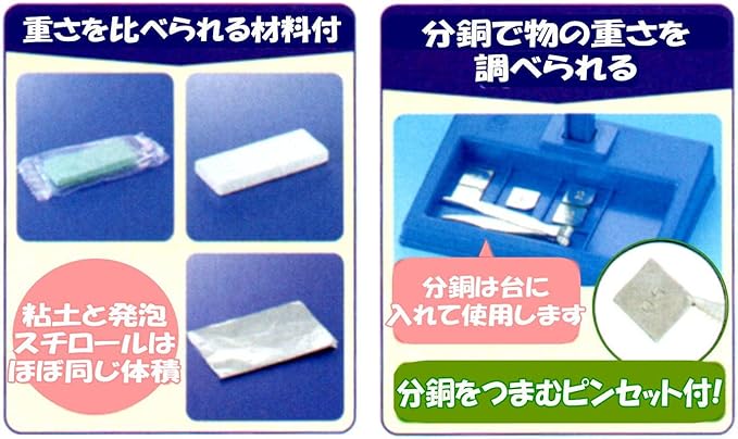 重さを比べられる材料付き(付属品の粘土と発泡スチロールはほぼ同じ体積)