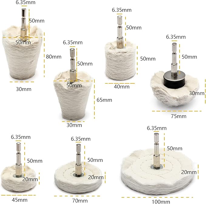 【セット内容】:この六角轴付きバフのパッケージには、さまざまの形と直径がありますので、最も窪んだ所への研磨を可能になる。 台形:長さ:70mm直径:70mm 台形:長さ:70mm直径:100mm 台形:長さ:70mm直径:45mm 円筒形:長さ:100mm直径:40mm 円錐形:長さ:140mm直径:30mm 円錐形:長さ:115mm直径:30mm きのこ形:長さ:80mm直径:75mm材質:コットンリンター。