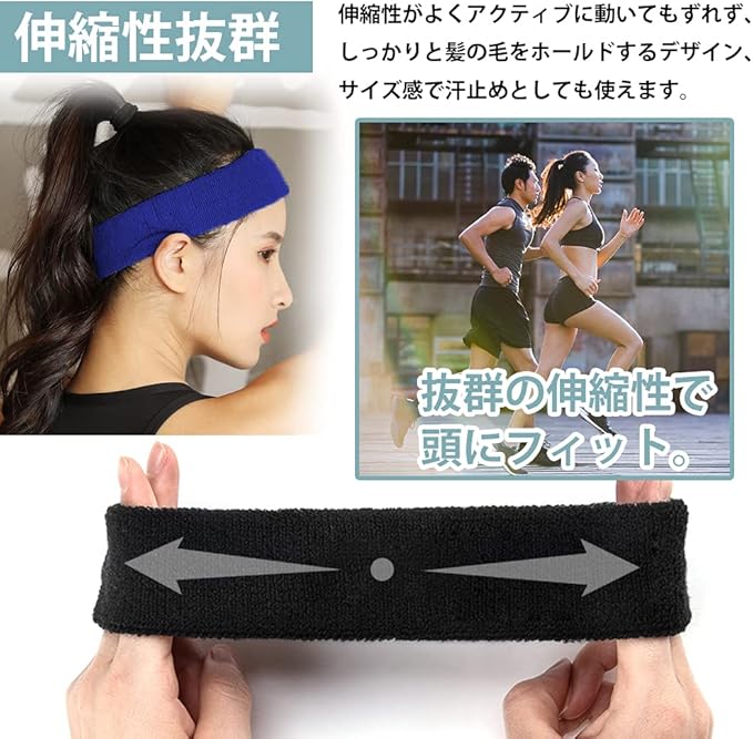 【伸縮性と通気性】適度な伸縮性なので、ダンスやランニングなど激しい運動でもズレたりせず、ピッタリとフィット!重さも感じないため付け心地も良く、あらゆるスポーツに最適なヘアバンドです。通気性の優れた素材を使用している為、様々なスポーツでお気軽にご使用いただけます。