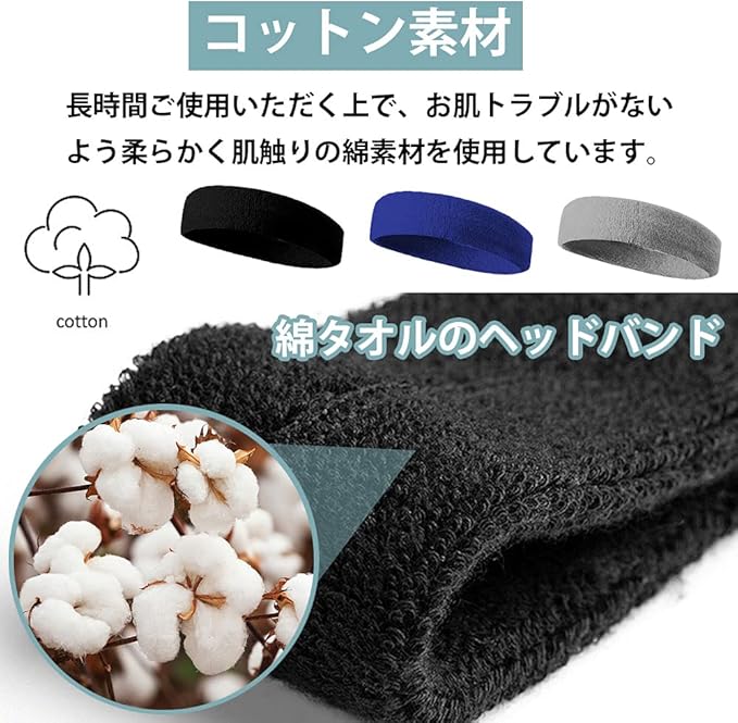 【綿タオルのヘアバンド】ヘアバンドはふんわりやさしい肌触り、色落ちや蒸れにくいです。敏感肌の方も使えます。通気性に優れた綿タオル生地は激しい運動の中で、爽快と快適が保持できる。肌触りが良いので洗顔時やまとめ髪、作業バンドとしてもご使用頂けます。軽量かつ柔軟性があり抜群の装着感。かさばらないので持ち運びにも困りません。