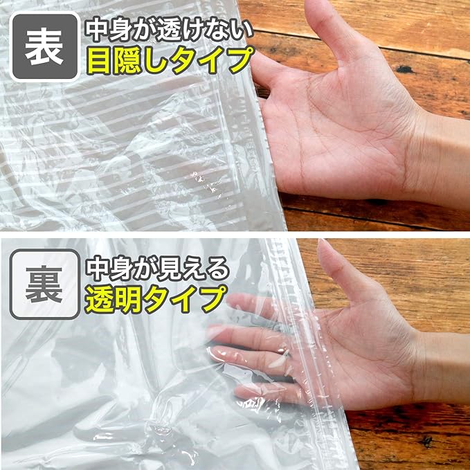 ●表面は中身が見えにくいストライブ柄。裏面は中身を確認できる透明です。