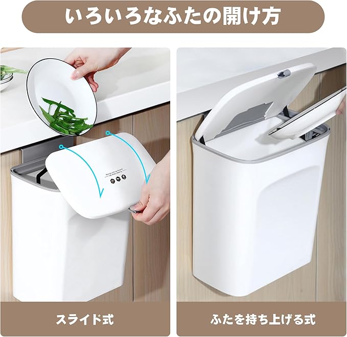 【壁掛けゴミ箱いろいろな蓋の開け方】:①スライド式:壁掛けゴミ箱のつまみを手前に引き蓋をスライドさせて開ける。②ふたを持ち上げる式:壁掛けゴミ箱のつまみを持ち上げて開ける。壁掛けゴミ箱はゴミを入れる板付きで、ごみ入れ板で入れれば、手が汚れないです。壁掛けゴミ箱は26cmの開口部なので、ゴミ捨てに入れやすくて、とても便利です。