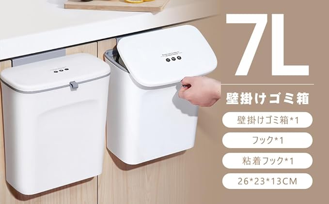 【壁掛けゴミ箱 セット詳細】:壁掛けゴミ箱 サイズ:約26cm*13cm*23cm。壁掛けゴミ箱 容量:7L。壁掛けゴミ箱 セット詳細:壁掛けゴミ箱 本体*1、フック*1、粘着フック*1。