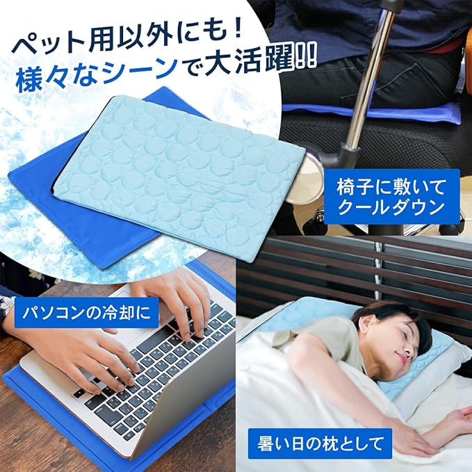 【ペット用クールマットとしてだけではない使い方】使い方は様々で、ひんやりクールな枕として、ノートパソコンの放熱として、椅子に敷いてひんやり座布団として、お使いいただけます。