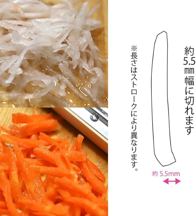 専用に開発された6mm穴の特製刃を使用しており、プロの料理人のような下ごしらえが簡単にできます。約5.5mmの太い千切りです。表面に凹凸が出来るので味のしみ込みが良くなります。