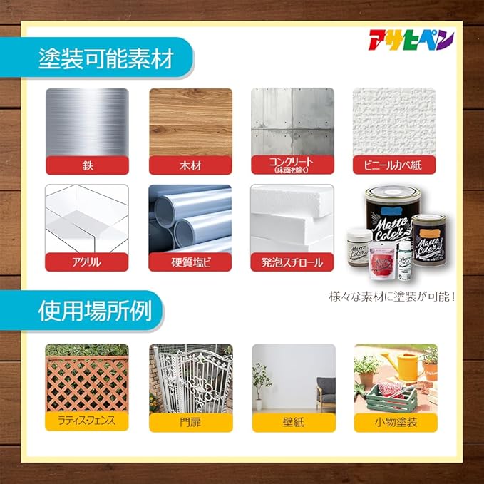 用途:(屋内外区分:屋内外用)ドア・板べい・ガーデン用品などの木部、家具・木工品などの木製品屋内外のコンクリート、スレート・ブロックなどの外カベフェンス・門扉・鉄柵・看板・おもちゃなどの鉄部・鉄製品室内カベ(カベ紙・ビニールカベ紙)発泡スチロール・アクリル・硬質塩ビのプラスチック面(他のプラスチック面には適しません)※化粧合板、床面、テーブルの天面、絶えず水がかかったり、いつも湿っているところには適しません。