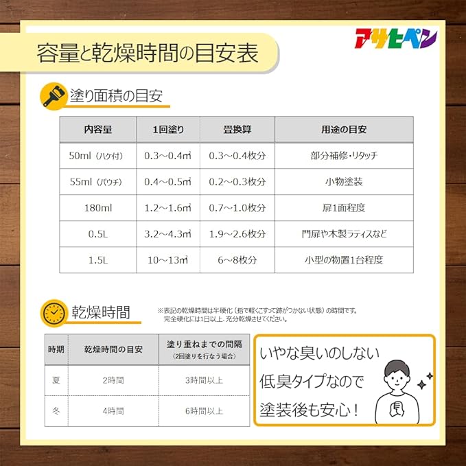 乾燥時間:夏期/2時間 冬期/4時間塗り重ね時間の目安:夏期/3時間以上 冬期/6時間以上
