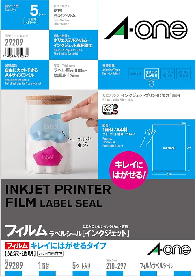 エーワン ラベルシール 光沢フィルム 透明 A4 ノーカット 5シート 29289