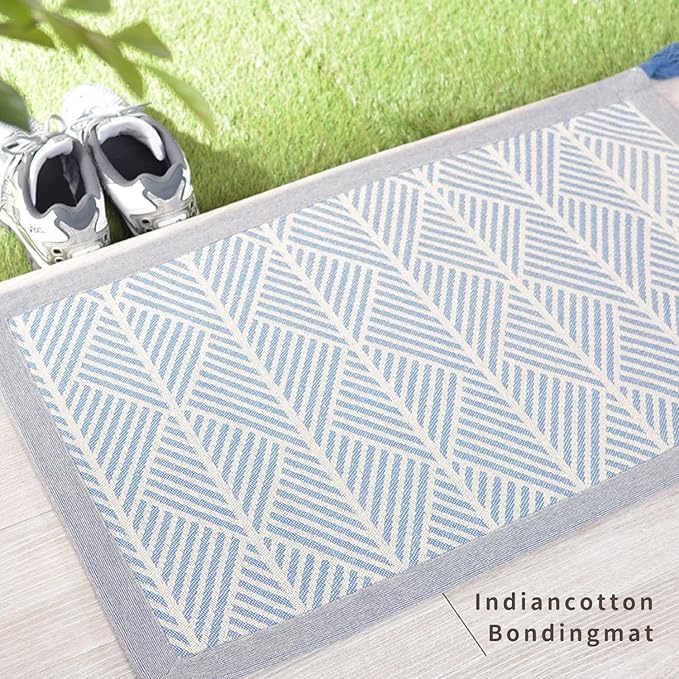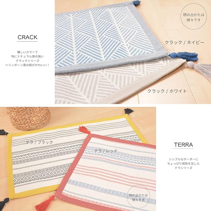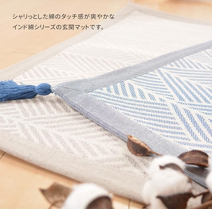 萩原 玄関マット 屋内 室内 ネイビー 約50 80cm 「クラック」 マット 洗濯機で洗える 滑りにくい加工付き 綿100% 幾何学柄 ヘリンボーン風 タッセル付き
