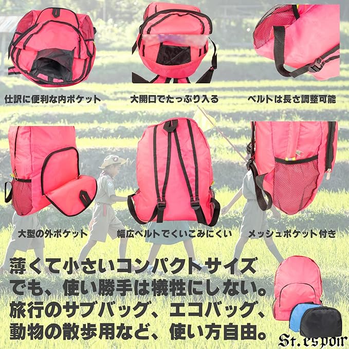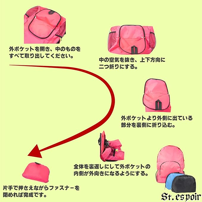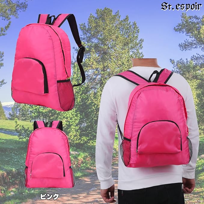 [St.espoir] 薄型 コンパクト ナイロン製 折り畳み リュック ピンク サブバッグ エコバッグ お買い物用 バッグとして 薄型でかさばらない スッキリ収納