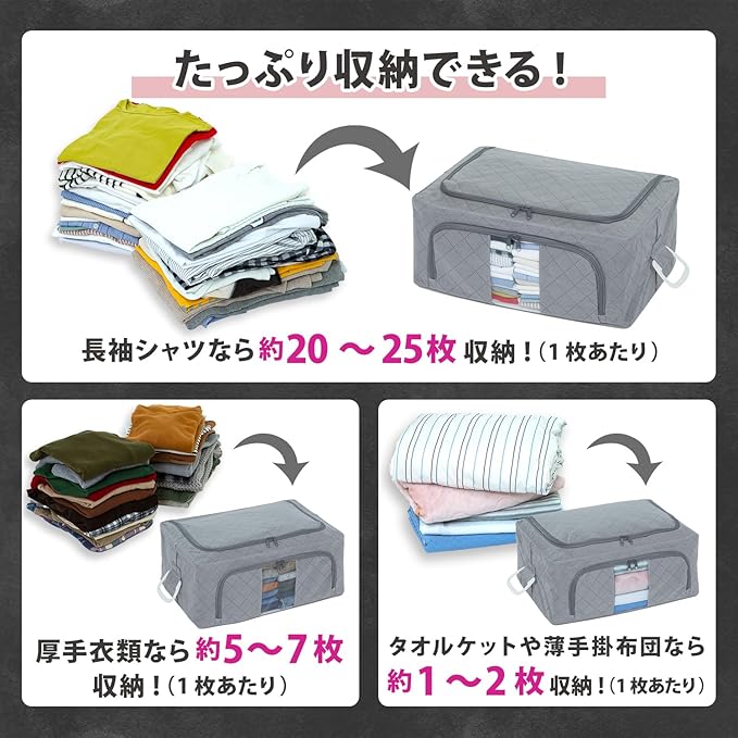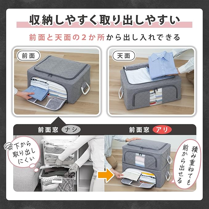 【ワイヤーと厚紙入りで丈夫】:ワイヤーと厚紙入りの底面でケースの形状をしっかりキープ。丈夫で積み重ねて使える(耐荷重12kg)。使わないときはワイヤーを折りたたんでスリムに収納。ダブルドア仕様で上からと前からの2箇所から衣類の出し入れができる。前面の透明窓で収納したまま中身が確認できる。